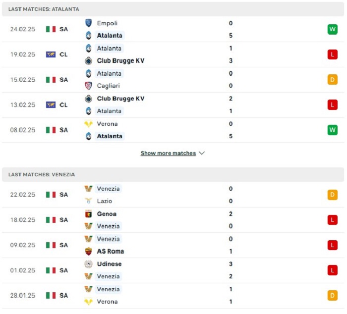 Phong độ gần đây Atalanta vs Venezia