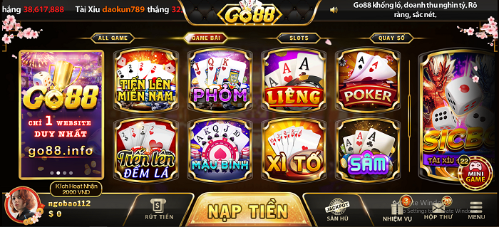 Cổng game bài Go88 cũng là một cái tên không tệ mà người chơi có thể tham gia. Được mệnh danh là sòng bài quốc tế, Go88 cho người chơi trải nghiệm đa dạng game chơi bài khác nhau như: Tiến lên miền nam, Mậu binh, Phỏm, Tiến lên đếm lá, Sâm lốc, Poker, Liêng, Blackjack,…
