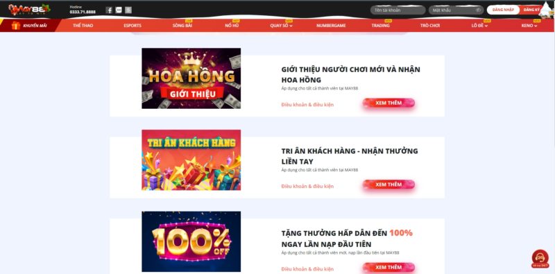 Không chỉ có dịch vụ cá cược phong phú bậc nhất mà May88 nổi tiếng là nhà cái tặng tiền cược thủ khi đang ký, và cũng cung cấp những khuyến mãi giá trị lớn như: